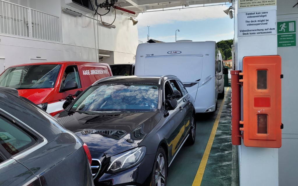 I skal være opmærksom på at færgen kun kan have 2 vogntog med hver gang + "det løse"